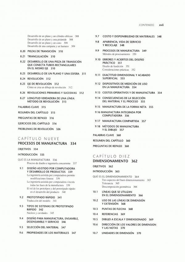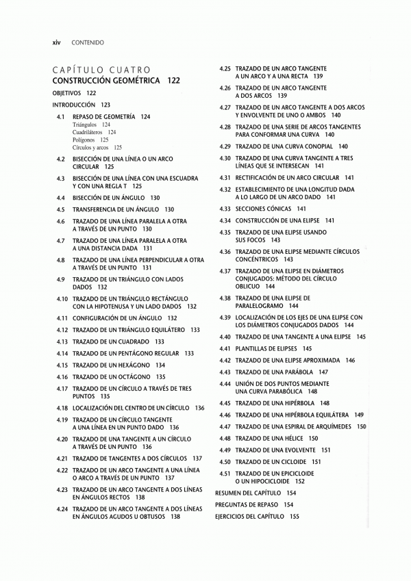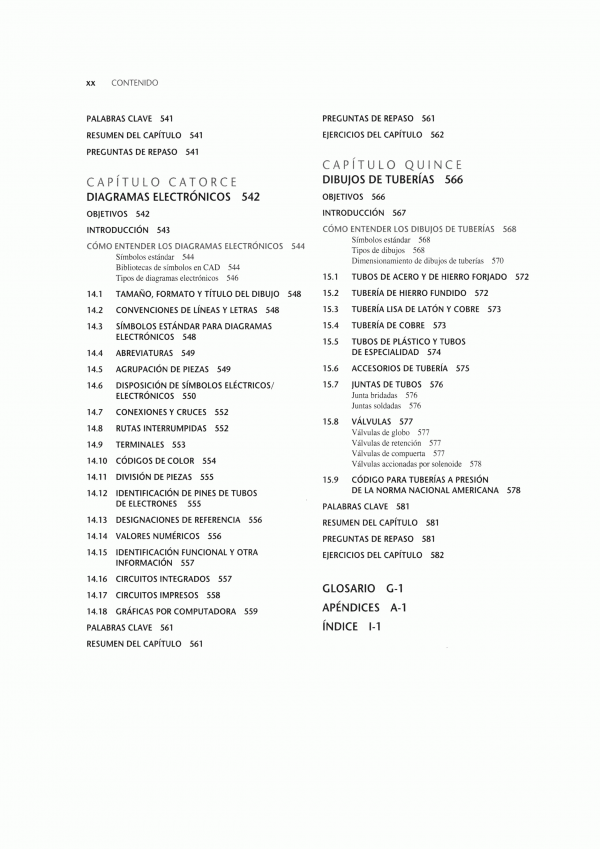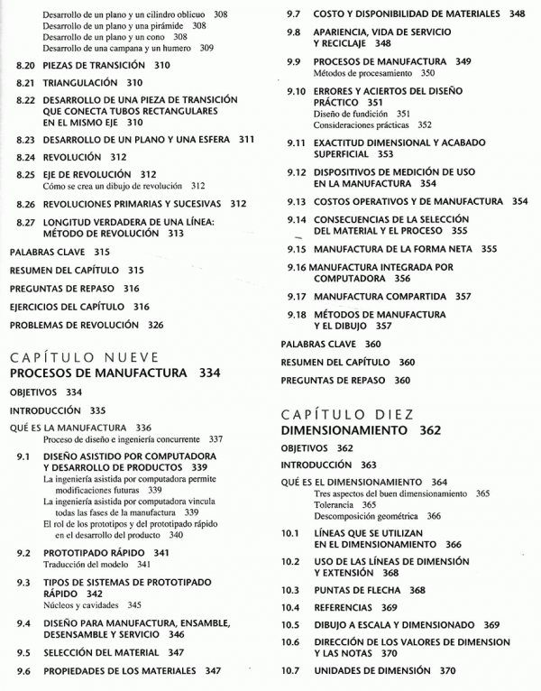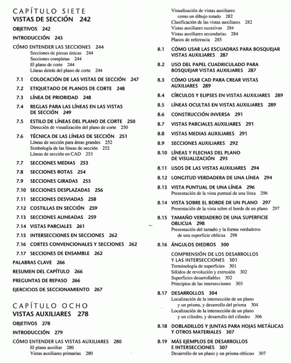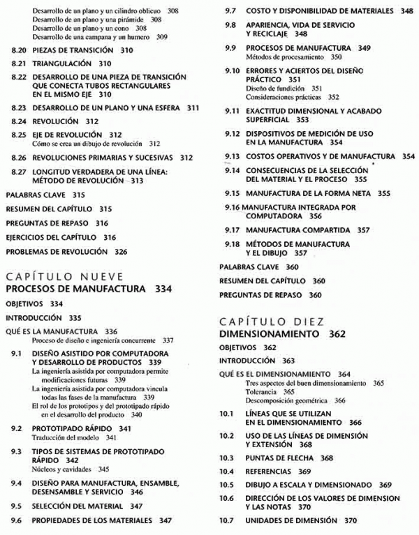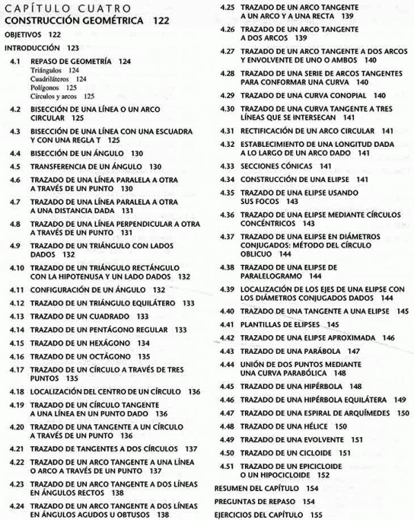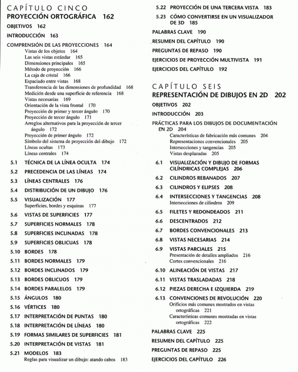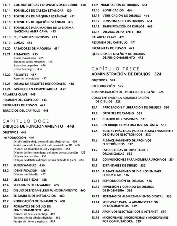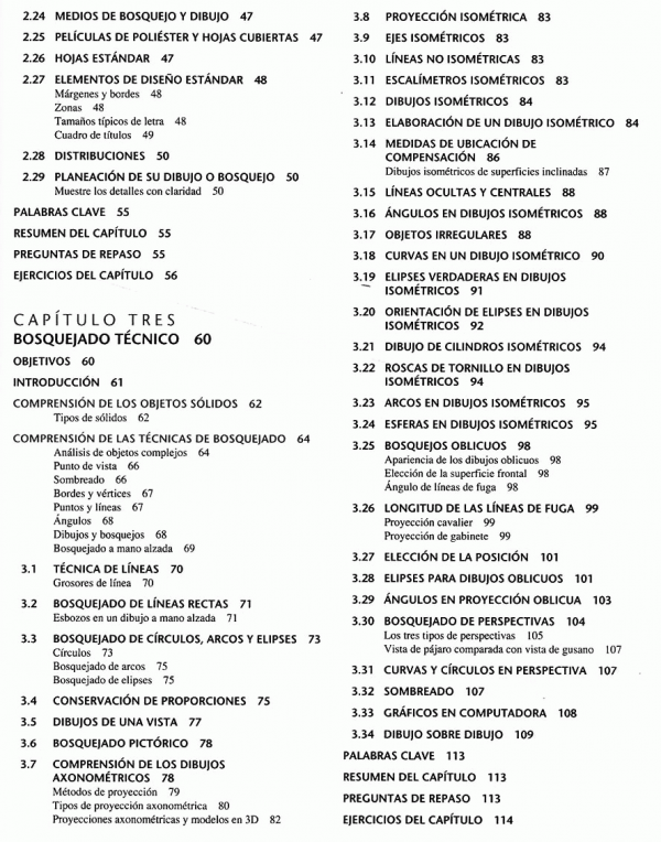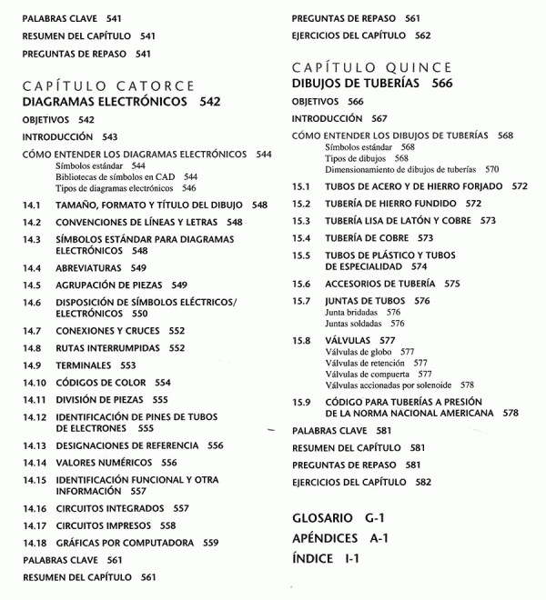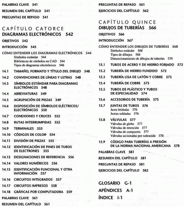 lenguaje gráfico universal para el diseño, distribuciones y letras, bosquejado técnico, construcción geométrica, proyección ortográfica, representaciones de dibujo en 2D, vistas de sección, procesos de manufactura, dimensionamiento, roscas, sujetadores y resortes, dibujos de funcionamiento, administración de dibujos, diagramas electrónicos, dibujos de tuberías.