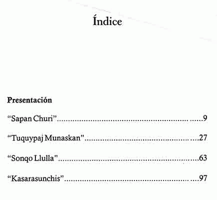 Resumen: Hay cuadros enmarcados en una peculiaridad y colorido emocionales. La tendencia de la obra es aleccionar al indio demostrando las perjudiciales consecuencias de la coca y el alcohol. Tucuypa munascaan, es en verdad, un drama muy sencillo. Lo que en el valen los diálogos; los apotecmas y las consejas. El estilo, en fin. Para interesar escenicamente le faltaran mas movimiento, mas vida, mas personaje.