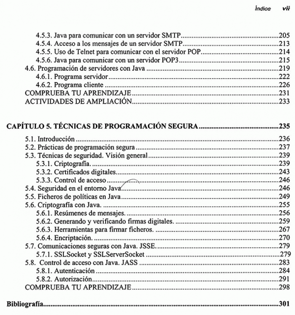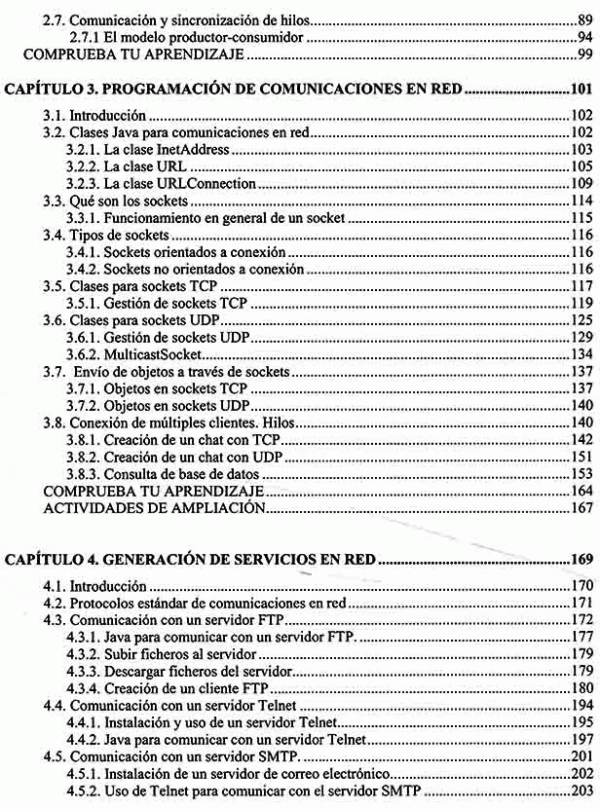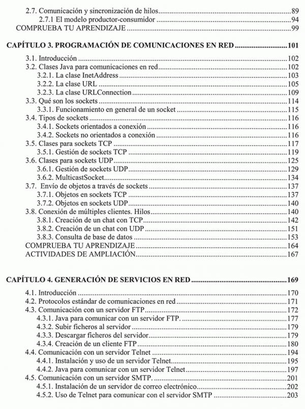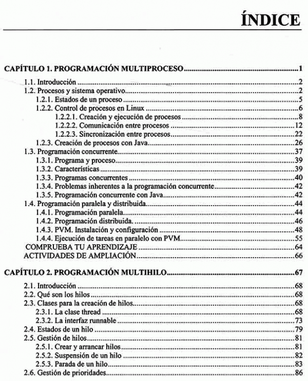 En el primer capítulo se estudian los procesos bajo Linux usando el lenguaje C. Se estudiarán diferentes funciones para crear y ejecutar procesos y mecanismos sencillos para comunicar y sincronizar procesos. Se estudian los conceptos básicos de la programación concurrente, paralela y distribuida. Al final del capítulo se utiliza la herramienta PVM (Parallel Virtual Machine) para crear programas paralelos en lenguaje C bajo Linux. En el segundo capítulo se estudia la utilización de hilos en Java, con ellos el alumno aprenderá a crear programas que realicen varias tareas simultáneamente. En el capítulo tres se estudian los sockets TCP y UDP en Java, con ellos podremos comunicar un programa cliente con un programa servidor a través de la red; también se usarán los hilos para crear aplicaciones cliente-servidor. En el capítulo cuatro se utilizará la librería de Java Apache Commons Net™ para crear programas cliente que se comuniquen con servidores FTP, SMTP y POP3, ya sean locales o remotos. Por último, en el capítulo cinco se estudiarán diferentes técnicas para crear aplicaciones seguras utilizando Java, se empezará estudiando el uso de los ficheros de políticas y a continuación se estudiarán las librerías JCA (Java Cryptography Architecture), JSSE (Java Secure Socket Extension) y JAAS (Java Authentication and Authorization Service).