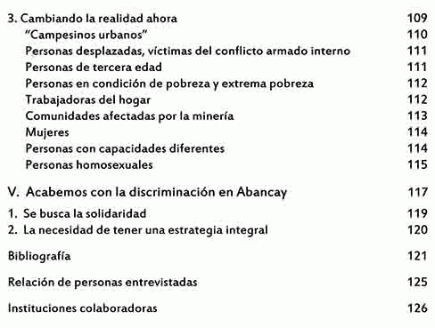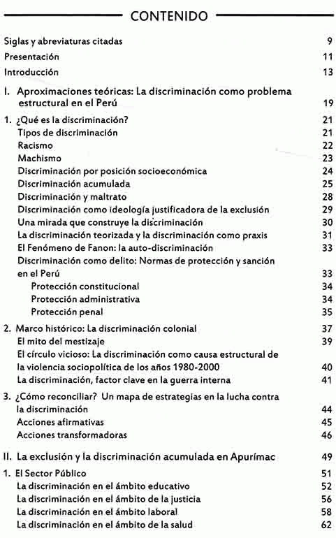 Resumen: En el presente diagnostico, sostenemos que , para ser debidamente combatida, la ideología de la discriminación debe ser comprendida en toda su complejidad. Por ello, entendiendo que la discriminación es casi siempre acumulada, es decir, que responde a construcciones complejas y cambiantes de acuerdo al contexto de quien es "débil" o "fuerte", nos proponemos analizar de que manera la ideología de la discriminación construye e impone quien es "débil" en la ciudad de Abancay, Apurimac.