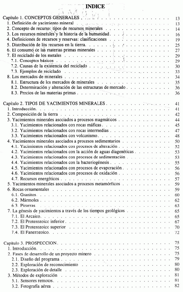 Este texto trata de los recursos minerales, tipología, prospecciòn evaluaciòn, explotaciòn, mineralurgia e impacto ambiental. La utilizaciòn de los recursos minerales es una actividad que se remontan a los albores de la civilizaciòn. El hombre ha sentido siempre la necesidad de buscar materias minerales, pues esta le ofrece una características de dureza belleza etc, que ningún otro componente de la tierra le podía suministrar..