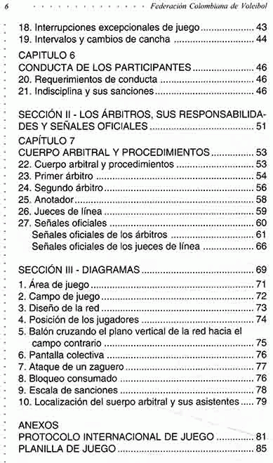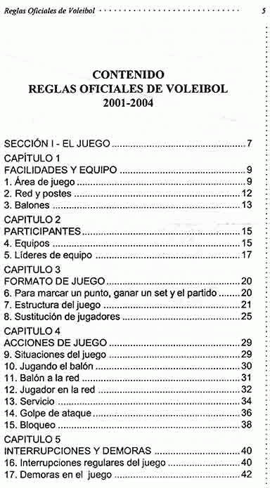 Reglas oficiales de boleibol 2002 - 2004 - facilidades y equipo - participantes - formato de juego - acciones de juego - interrupciones y demoras - conducta de los participantes - los árbitros, sus responsabilidades y señales oficiales - cuerpo arbitral y procedimientos - diagramas.