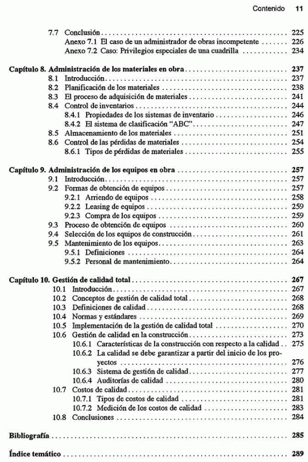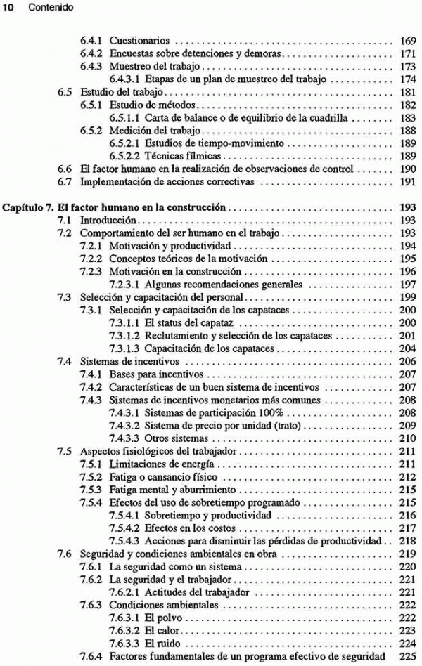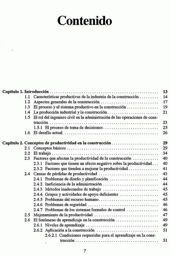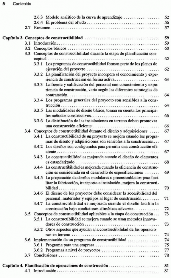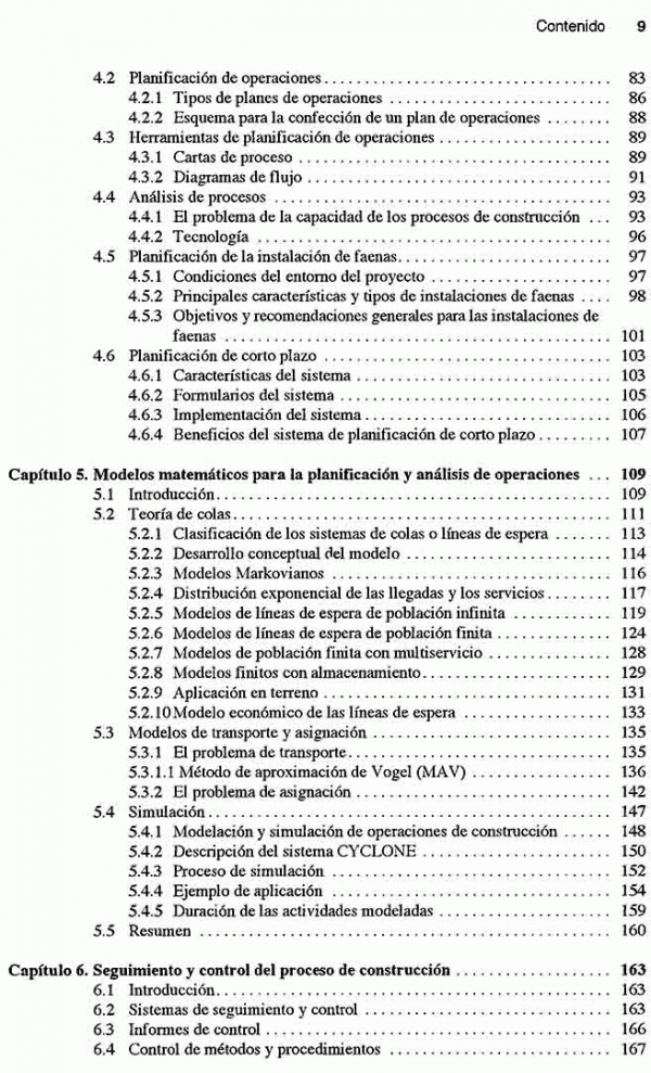 Conceptos de productividad en la construcción - Conceptos de constructibilidad - Planificación de operaciones de construcción - Modelos matemáticos para la planificación y análisis de operaciones - Seguimiento y control del proceso de construcción - El factor humano en la construcción - Administración de los materiales en obra - Administración de los equipos en obra - Gestión de calidad total.