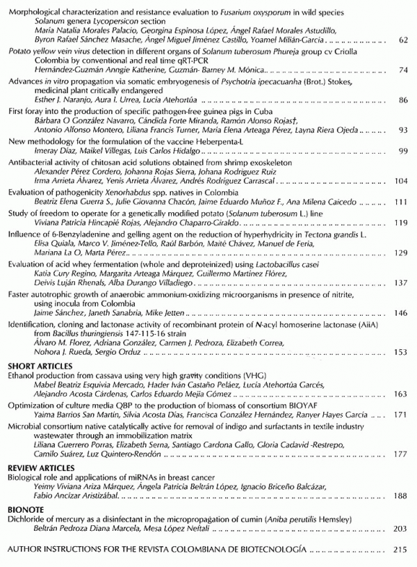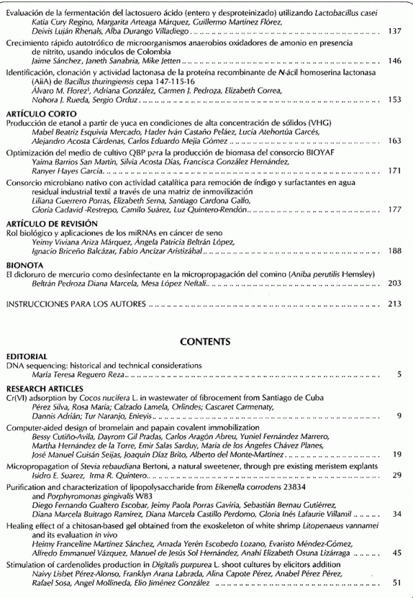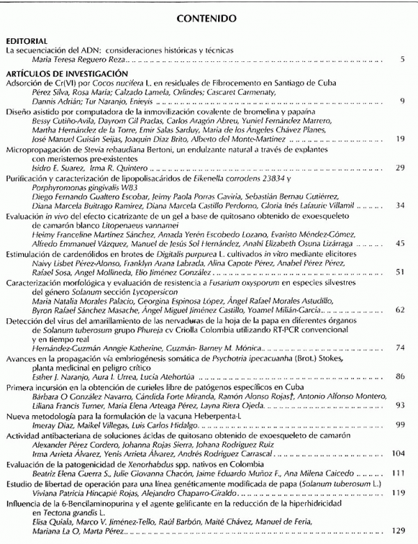 Adsorcion de Cr por cocos nucifera L. en residuales de fibrocemento en santiago decuba, diseño asistido por computadora de la inmovilizacion covalente de bromelina y papaina, micropogacion de stevia rebaudiana bertoni, un endulzante natural a traves de explanes con meristemos pre-existentes, purificacion y caracterizacion de liposacaridos de ekenella corrodens, evaluacion in vivo del efecto cicatrizante de un gel a base de quitosano obtenido de exoesqueletos de camaron blanco, estimulacion de cardenolidos en brotes de digitalis purpurea y otros.