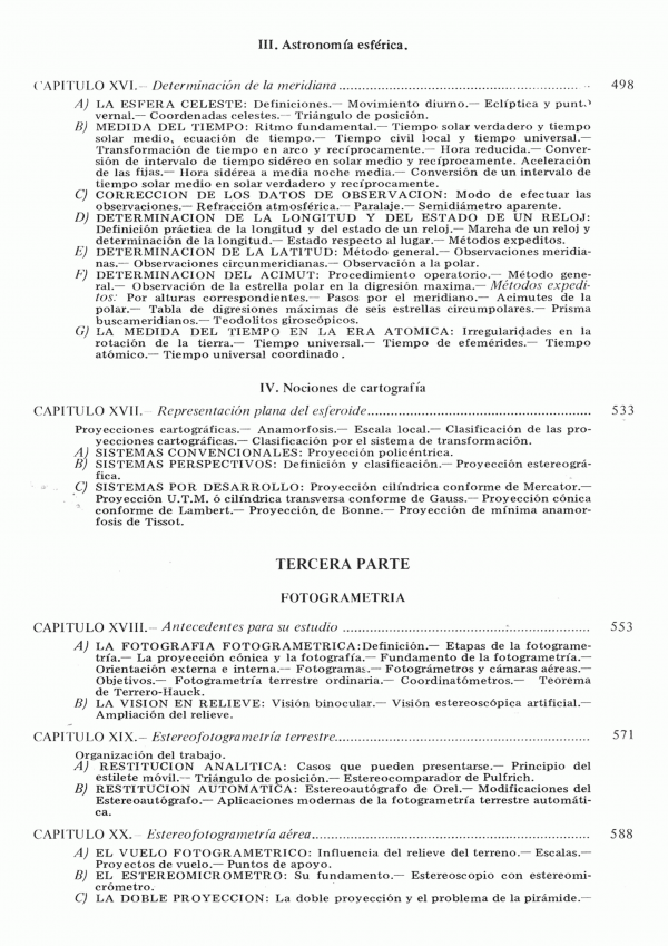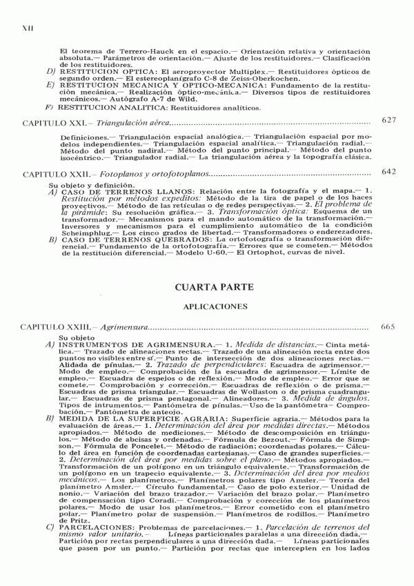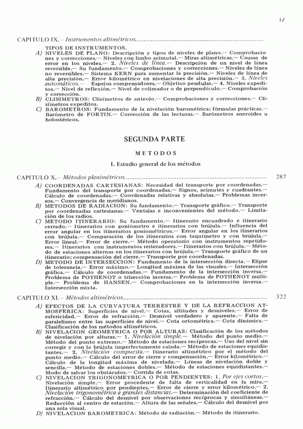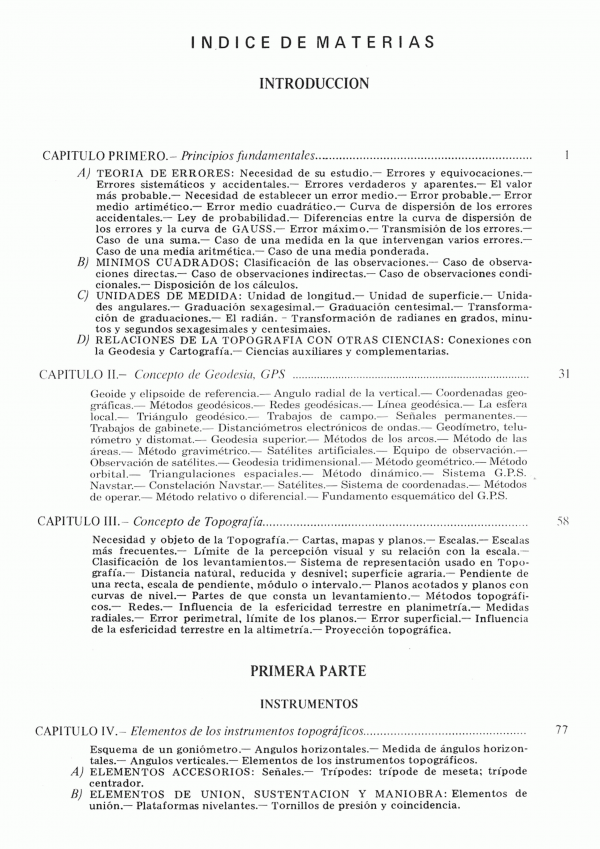 Principios fundamentales. Concepto de geodesía GPS. Concepto de topografía. Primera Parte Instrumentos. Elementos de los instrumentos topográficos. El teodolito. Taquímetros ópticos y electrónicos. La brújula. La plancheta y alidada. Instrumentos altimétricos. Segunda Parte Metodos. Estudio general de los métodos. Métodos planimétricos. Métodos altimétricos. Levantamiento topográfico. Astronomía esférica. Tercera Parte Fotogrametria. Antecedentes para su estudio. Estereofotogrametría terrestre. Esterofotogrametría aérea. Triangulación aérea. Fotoplanos y ortofotoplanos. Cuarta Parte. Aplicaciones. Agrímensura. Levantamiento de grandes zonas parceladas. Levantamiento subterráneos. Aplicación de la topografía a la redacción de proyectos. Replanteos.