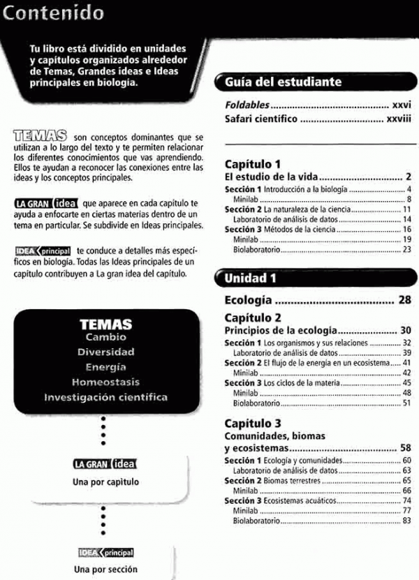 Ofrece un panorama muy completo de la biología actual, pues a lo largo de cada tema, incluye diversas secciones con lecturas, artículos científicos, conexiones con otras ciencias, entrevistas con biólogos e investigadores, recuadros sobre biología y sociedad.