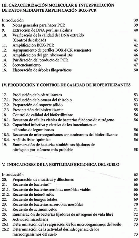 Manual de Microbiología Agrícola: RHIZOBIUM, PGPRs, Indicadores de Fertilidad e Inocuidad, se enfocan principalmente en el estudio de los suelos para la producción de diversos cultivos de manera sostenible. En los últimos años se ha incrementado la demanda de análisis microbiológicos en suelos, agua de riego y residuos orgánicos, que nos indican la riqueza natural de estos sustratos; y aún por empresas que trabajan a nivel de explotación de cultivos, cuyas exigencias se basan en las normas de Eurepgap, son mayores cuando se trata de productos orgánicos. Estas involucran las buenas prácticas agrícolas, seguridad alimentaria, protección del ambiente y salud. Pero además, los pequeños agricultores cuya proyección es ofrecer productos nativos manejados de manera tradicional, también requieren de estas técnicas y conocimientos. El presente manual se organiza en 6 capítulos con un total de 30 temas.