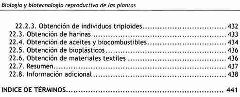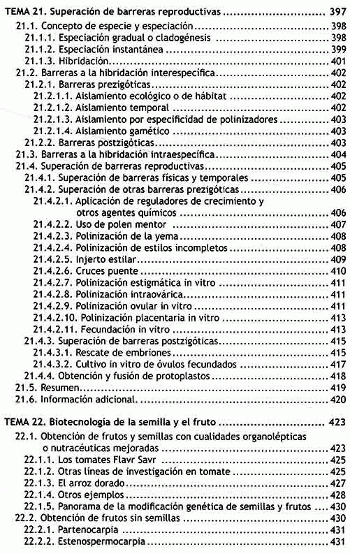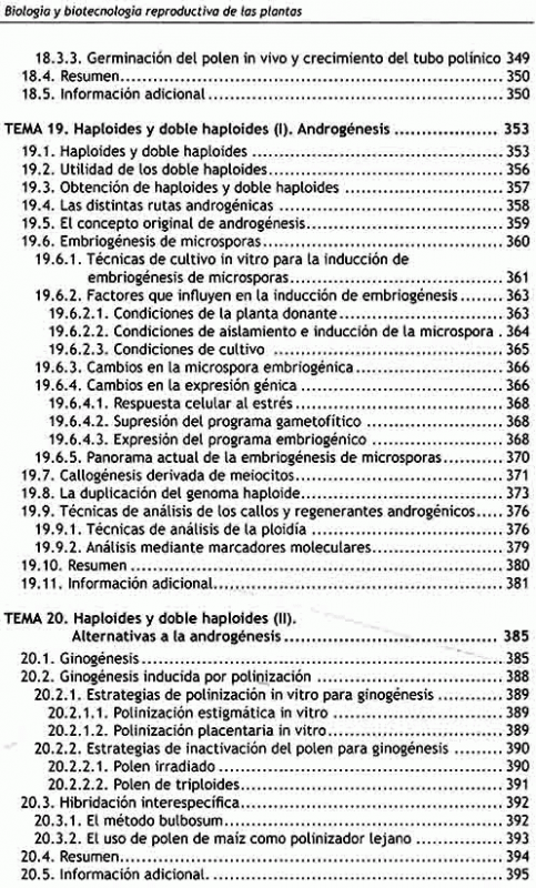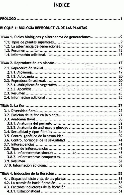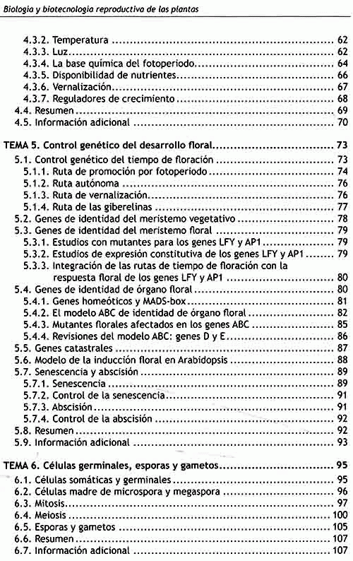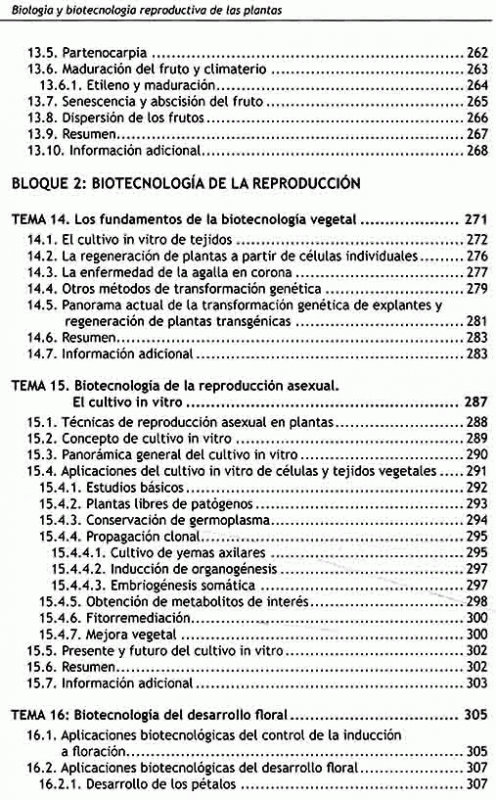 La biología reproductiva de las plantas engloba todos los procesos que permiten a un organismo vegetal tener descendencia, sea por vía sexual o asexual. El conocimiento de estos procesos es esencial para poder sacar provecho de ellos mediante aproximaciones biotecnológicas. Esta obra, dividida en dos grandes bloques, dedica el primero de ellos a la exposición secuencial de todos estos procesos (inducción y desarrollo floral, gametogénesis, polinización, fecundación, embriogénesis, formación, maduración y dispersión de frutos y semillas, etc). El segundo bloque se centra en las distintas aplicaciones biotecnológicas derivadas de los procesos reproductivos, de interés práctico en muy distintos ámbitos de la sociedad.