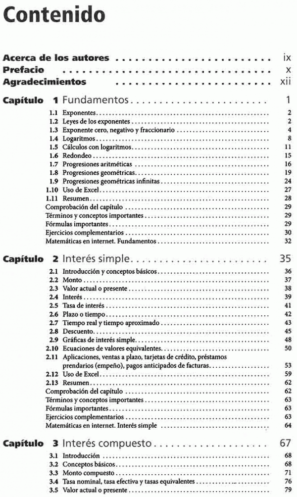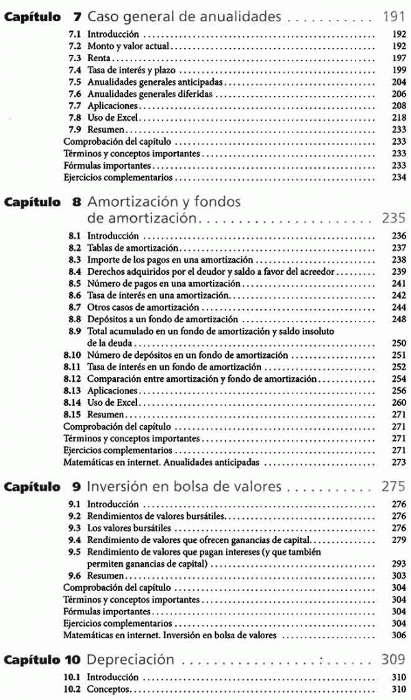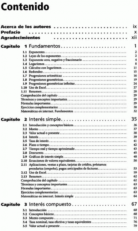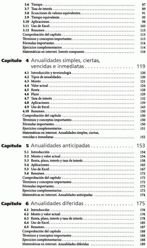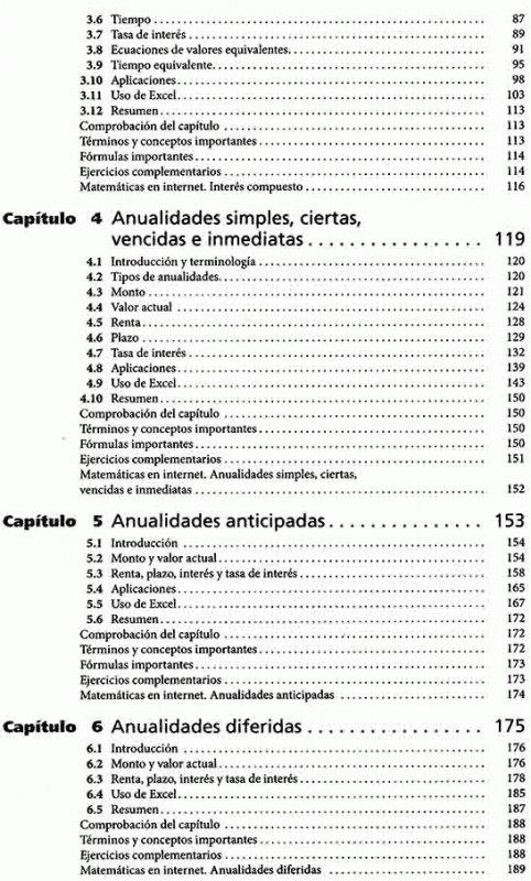 Esta quinta edición conserva el propósito fundamental de presentar las herramientas matemáticas necesarias para evaluar la equivalencia del valor del dinero en diferentes tiempos y circunstancias, de la manera más sencilla y didáctica posible. Mediante su estudio, el lector adquirirá los conocimientos necesarios para comprender cómo se deben manejar cantidades monetarias, así como las variaciones que sufren con el paso del tiempo. Esta nueva edición ha sido revisada y actualizada por los autores, sobre todo en lo que se refiere a la utilización de las tasas de interés vigentes. Sus principales características son: - Resolución detallada de numerosos ejercicios con datos reales que ilustran detalladamente los conceptos relevantes y los procesos de cálculo. - Sección “Uso de Excel®” en todos los capítulos, se desarrollan ejemplos resueltos en el texto con este software. - Sección “Matemáticas en Internet” al final de cada capítulo. - Introducción a las anualidades crecientes, el cual es un tema de especial interés para los planes de pensiones. Sin lugar a dudas, esta obra resulta un material de gran aportación por su estilo claro y sencillo aún en los temas más complejos
