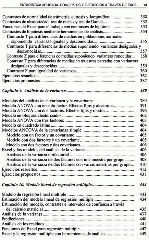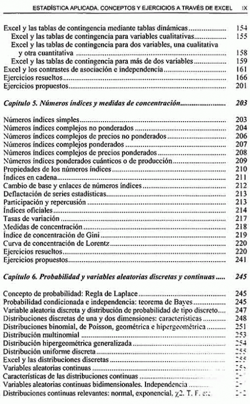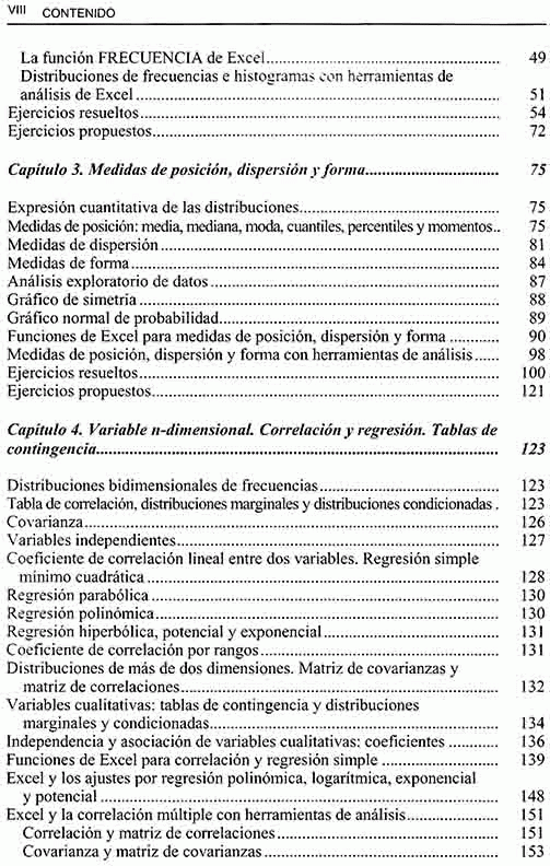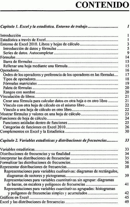Se comienza tratando los temas más sencillos, como pueden ser la estadística descriptiva, variables aleatorias discretas y continuas, tablas de frecuencias para variables unidimensionales y bidimensionales, independencia y relación entre variables, regresión y correlación, variables cualitativas, tablas de contingencia y números índices. Más adelante, y a medida que se avanza en contenido, se tratan temas como las distribuciones de frecuencias, leyes de probabilidad, funciones de densidad, funciones de distribución, valores críticos y otras características. Por último, se abordan temas estadísticos ya más especializados, como intervalos de confianza, contrastes de hipótesis, estimación no paramétrica, modelos del análisis de la varianza, modelos de regresión múltiple, modelos de series temporales y programación lineal y optimización.