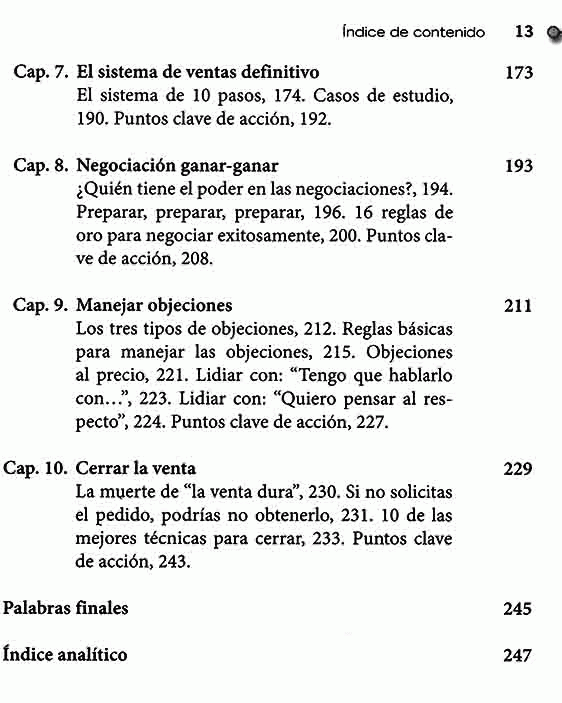 El autor de este libro comparte con los lectores el privilegio de que, durante más de tres décadas, ha tenido que trabajar con gente de todos los niveles en distintas organizaciones y a la vez, la oportunidad de observar que las personas más exitosas tienen cuatro atributos claves que superan, hasta cierto punto, la falta de habilidad en las ventas, éstos son: visión, compromiso, determinación y persistencia. Bruce King propone a quienes se dedican al área de ventas, combinar dichas cualidades con las habilidades que ya poseen para llegar a la cima de su profesión.