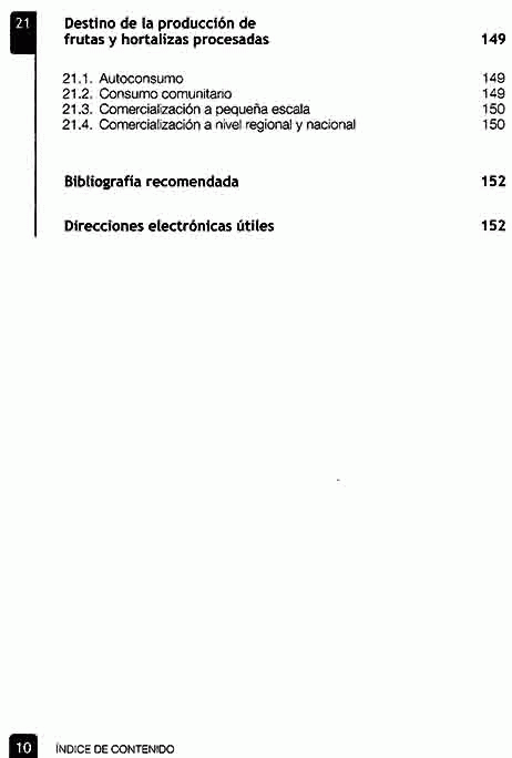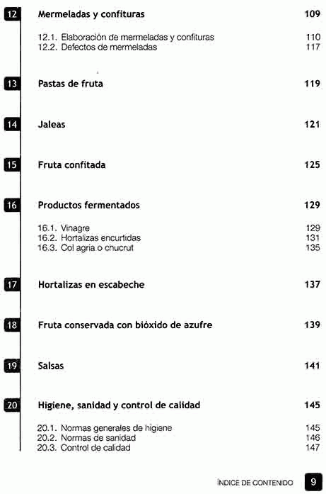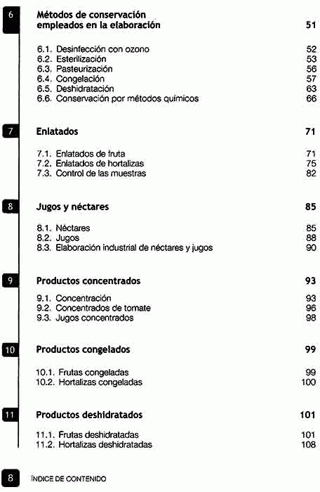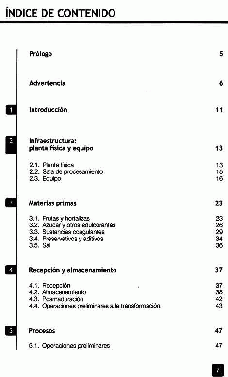 Infraestructura: planta física y equipo, materias primas, recepción y almacenamiento, procesos, métodos de conservación empleados en la elaboración, enlatados, jugos y néctares, productos concentrados, productos congelados, productos deshidratados, mermeladas y confituras, pastas de fruta, jaleas, fruta confitada, productos fermentados, hortalizas en escabeche, fruta conservada con bióxido de azufre, salsas, higiene, sanidad y control de calidad, destino de la producción de frutas y hortalizas procesadas.
