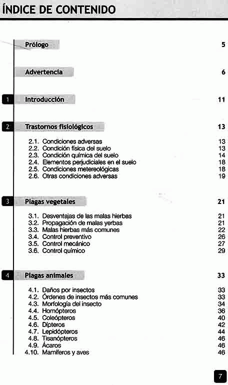 Los trastornos fisiológicos en las plantas, provocados por las condiciones física y química del suelo, climas adversos, agentes meteorológicos y muchos otros factores vinculados con la actividad agrícola, pueden combatirse mediante el manejo adecuado de suelos y cultivos. Este manual, correspondiente al área Producción vegetal no sólo muestra a los estudiantes, técnicos y productores agropecuarios las numerosas causas de pérdidas y daños que enfrenta la agricultura en nuestro país, sino que además, expone la gran variedad de métodos para el control de plagas animales y vegetales con que cuenta actualmente la tecnología agrícola. Así, provee al lector la información referente tanto a los síntomas de plagas y enfermedades de los cultivos, como a los productos y formas de aplicación disponibles para su prevención y combate.