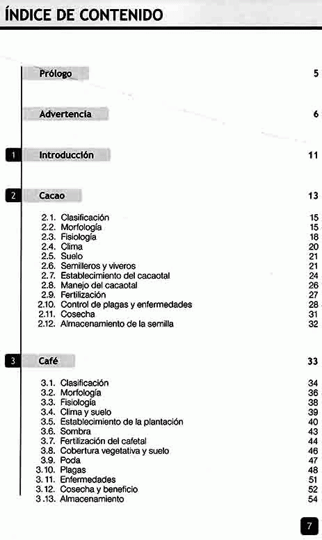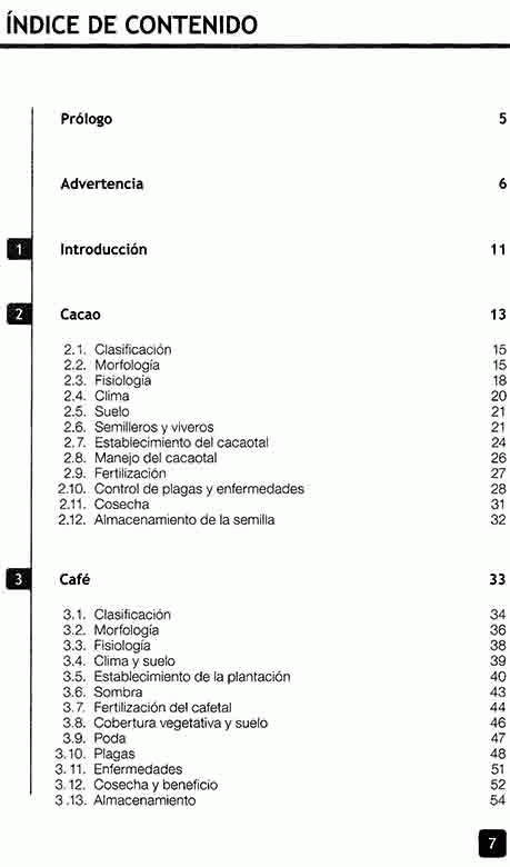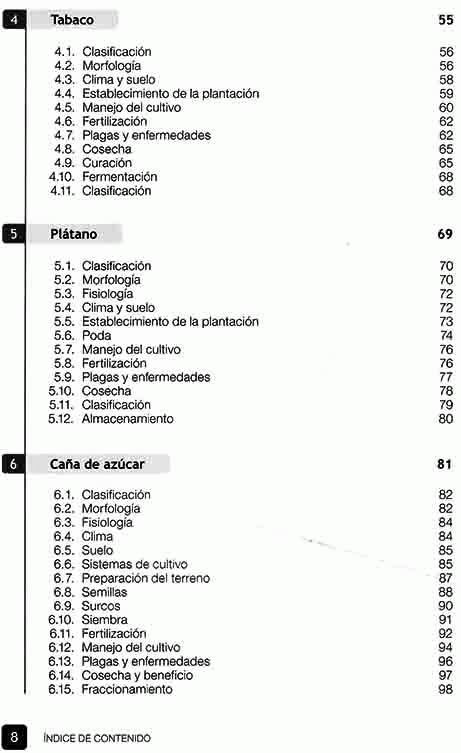 Los cultivos e plantación ocupan áreas relativamente grandes y exigen tecnología agrícola de tipo industrial para la optimizacion de las cosechas. Tanto los grandes como los pequeños productores - quienes generalmente cultivan plantaciones a la manera tradicional - se beneficiaran con este manual que expone con detalle todos los factores que deben considerar para proteger sus cultivos, desde la germinacion de las semillas y el establecimiento de la plantación, hasta el control de malezas, plagas y enfermedades.