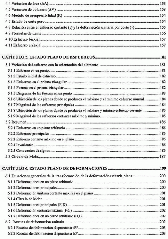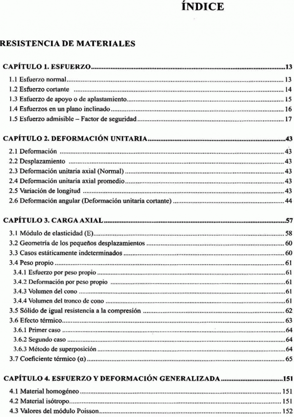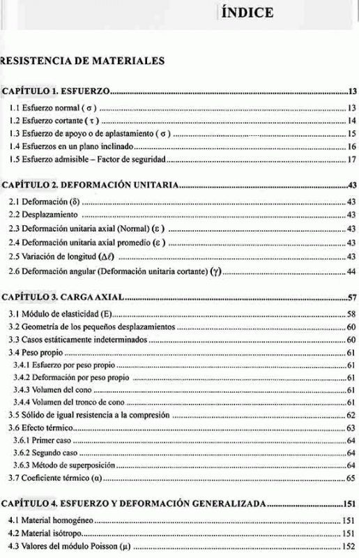 La presente publicación desarrolla los lineamientos básicos de la resistencia de materiales clásica y contiene temas fundamentales, como esfuerzo, deformación unitaria, deformaciones axiales, biaxiales y triaxiales. Además, estudia el efecto de torsión para diferentes secciones transversales; el estado plano de esfuerzo y deformaciones cuyo objetivo es determinar los máximos esfuerzos; y los esfuerzos en vigas y deformaciones en vigas a través de diferentes métodos, cuyo objetivo es determinar las máximas deformaciones.