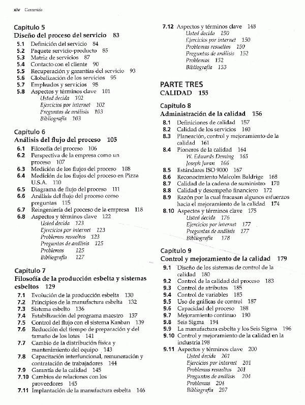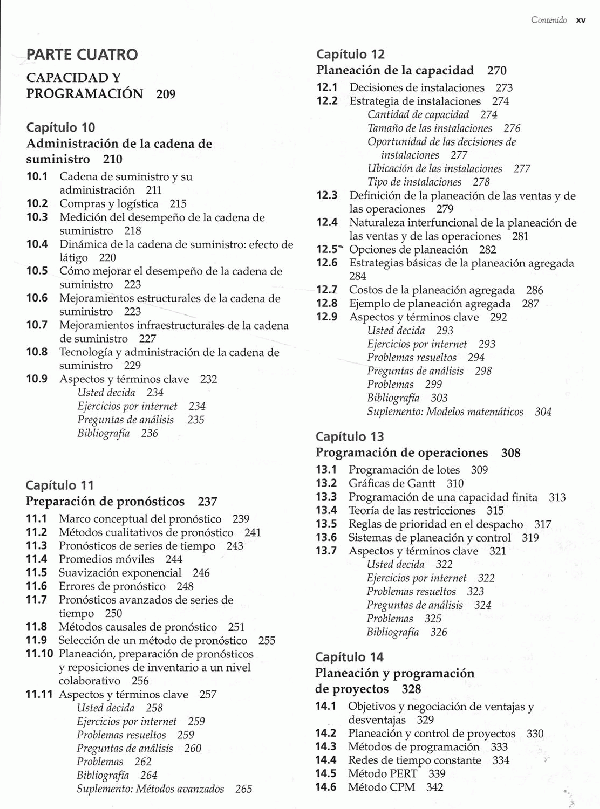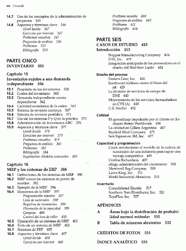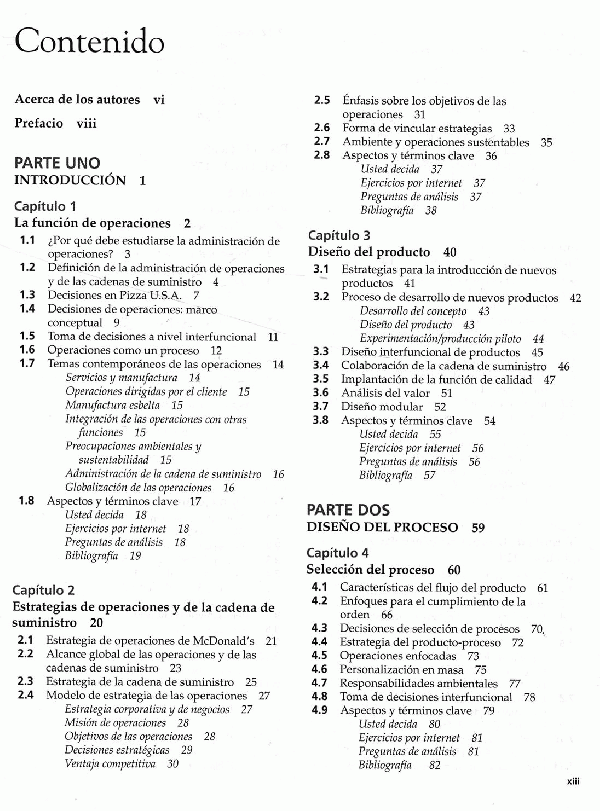 INDICE: 1. Introducción al campo de las operaciones, 2. Operación y estrategia de suministros, 3. Administración de proyectos, 4. Diseño de productos y servicios, 5. Capacidad estratégica de la capacidad, 5A. Curvas de aprendizaje, 6. Diseño de trabajo, 7. Procesos de manufactura, 8. Procesos de servicio, 9. Calidad (Six-Sigma), 10. Estrategia de cadena de suministros, 11. Ubicación y logística, 12. Procesos de manufactura, 13. Consultoría de operaciones y reingeniería, 14. Planeación de recursos y sistemas, 15. Administración de la demanda y pronósticos, 16. Planeación y operación de ventas, 17. Control de inventarios, 18. Planeación de los requerimientos de material, 19. Horarios de operación, 20. Simulación.