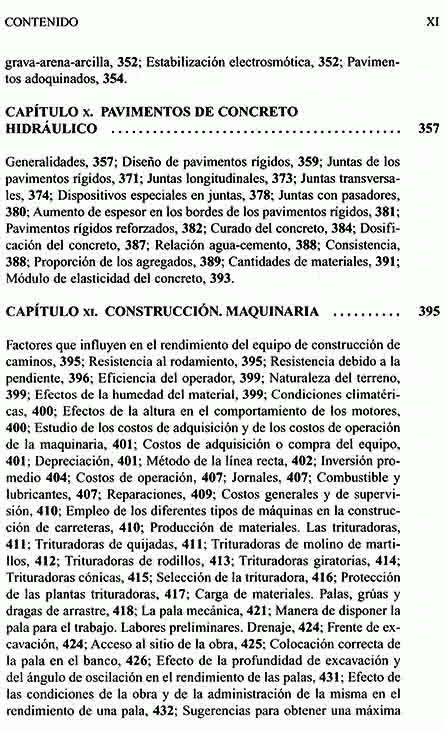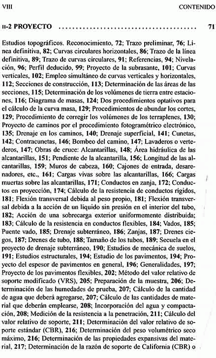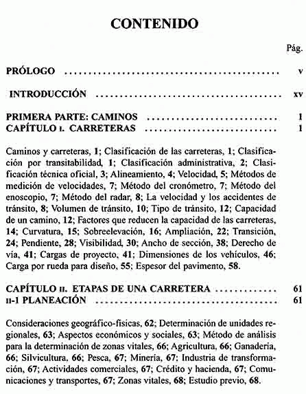 CONTENIDO: Esta obra es de gran utilidad en la práctica de Ingeniería Civil, ya que cubre los diferentes temas que se exigen en los programas del área de los transportes; sirve de consulta para los ingenieros que se dedican a los más importantes trabajos en diseño, construcción y conservación de vías de comunicación con técnicas menos sofisticadas y más baratas que las empleadas en países con grandes recursos económicos. Se presentan, de manera sencilla y didáctica, los aspectos principales de la materia; además tiene la gran ventaja de que los temas se pueden dividir y adaptarse a los diversos programas de las universidades, sin que por ello se pierda la coherencia en la exposición.