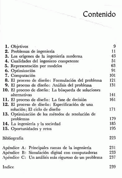Problemas de ingeniería - Los orígenes de la ingeniería moderna - Cualidades del ingeniero competente - Representación por modelos - Optimización - Computación - El proceso de diseño : formulación del problema - El proceso de diseño : análisis del problema - El proceso de diseño : la búsqueda de soluciones alternativas - EL proceso de diseño : la fase de decisión - El proceso de diseño : especificación de una solución; el ciclo de diseño - Optimización de los métodos de resolución de problemas - La ingeniería y la sociedad - Oportunidades y retos.
