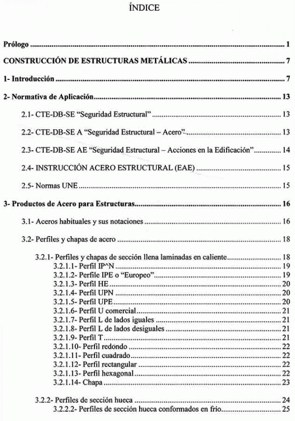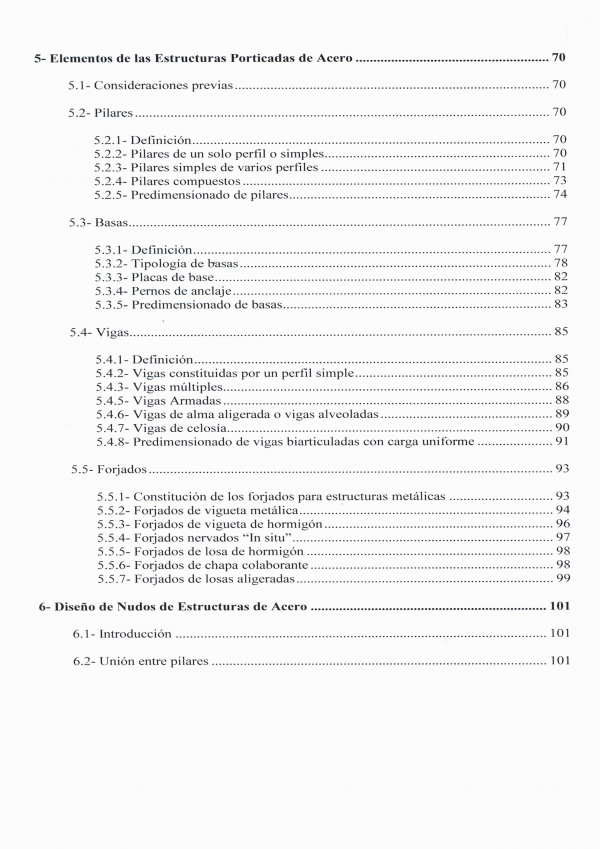 El presente libro, trata de todo lo referente a la construcción de las estructuras de acero laminado. De los productos de acero en que se proyectan y se ejecutan y de las características de los aceros en que se laminan. De los tipos de estructuras porticadas o de pisos y de naves o de grandes luces. De los elementos: pilares, losas, vigas, forjados, cerchas, etc. que las constituyen. Del proyecto y ejecución de las uniones de los diferentes elementos. De la protección a la corrosión y el fuego de las estructuras.