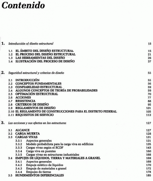 Este libro pretende dar una visión unificada del proceso a través del cual se realiza el proyecto estructural de las construcciones de la ingeniería civil. En lugar de recopilar normas, reglas, y procedimientos de diseño, el énfasis se pone en el planteamiento de los objetivos de diseño y en la fundamentación de los procedimientos. Se destacan las incertidumbres implícitas en las distintas fases del proceso y la forma en que éstas deben reflejarse en los factores de seguridad que se adoptan. Se abordan detalladamente las cargas y acciones que se generan por el propio funcionamientos de la construcción o por fenómenos naturales y la forma de tener en cuenta sus efectos en las estructuras; el modo en que las propiedades de los materiales y la forma de las estructuras influyen en el comportamiento de las mismas; no se incluyen procedimientos de diseño de materiales particulares como concreto, acero o madera, de las que se considera deben formar parte de textos específicos.