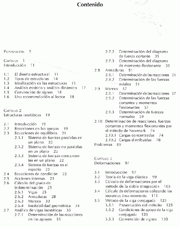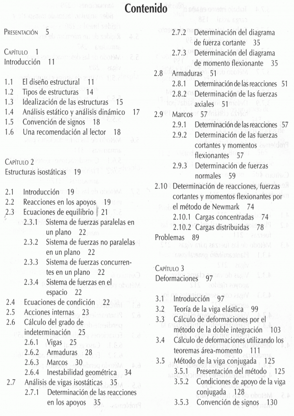 Este libro ha sido creado con el propósito fundamental de ayudar a profesores y alumnos en la enseñanza y el aprendizaje del análisis estructural- Esta disciplina constituye uno de los pilares de la carrera de ingeniería civil y es también importante en algunas otras licenciaturas, como ingeniería mecánica y arquitectura. Su dominio es indispensable para los profesionales que se dedican al diseño de algunas de las obras más espectaculares que construye el ser humano: rascacielos, puentes, presas, plantas industriales, plataformas marítimas, etcétera. El análisis estructurales, asimismo, una de las asignaturas que más contribuyen a la formación de los alumnos, a su entrenamiento en el manejo de conceptos abstractos y a la adquisición de habilidades intelectuales requeridas para el ejercicio profesional de la ingeniera. Por estas razones ha ocupado. desde hace mucho tiempo, un lugar destacado en los planes de estudio.
