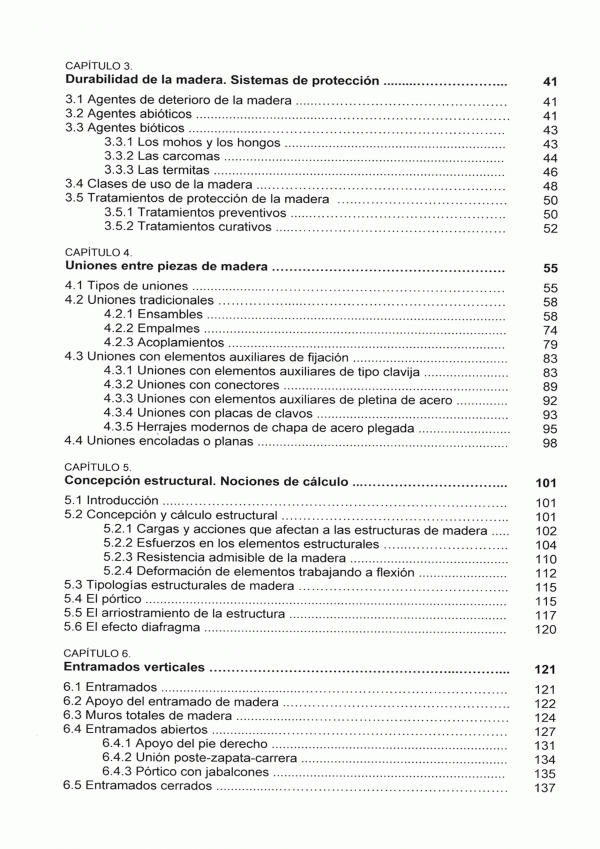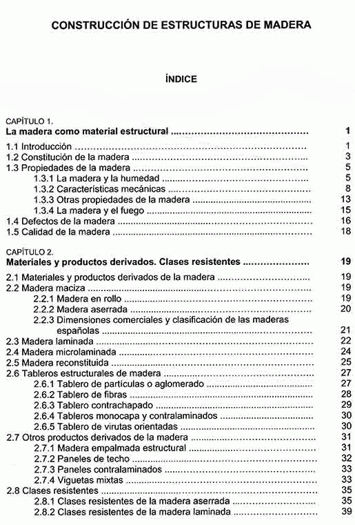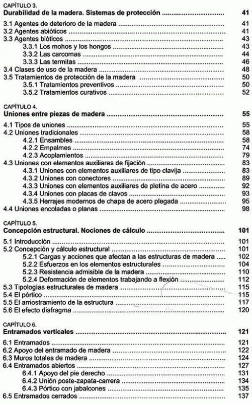 Este libro se incluyen numerosos detalles constructivos, tablas y fotografías, de estructuras tradicionales y modernas, con un fin práctico y actual para la ejecución de rehabilitaciones y de obra nueva. Se describen los diferentes elementos y sistemas estructurales, cómo trabajan y cómo se unen entre sí, respetando las características de la madera para lograr la máxima durabilidad.
