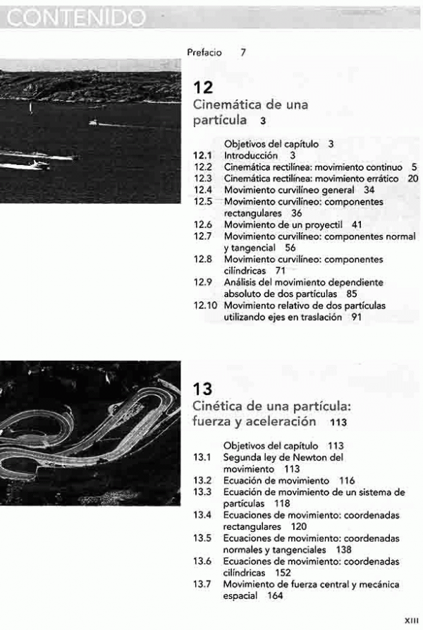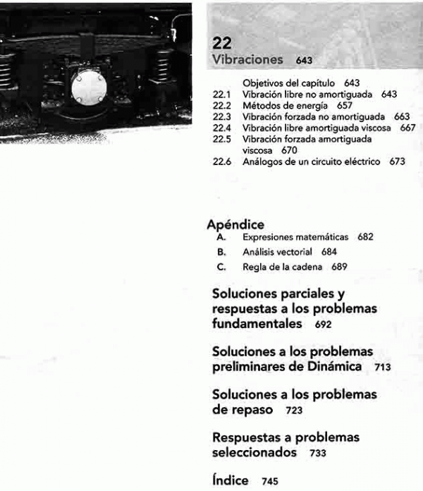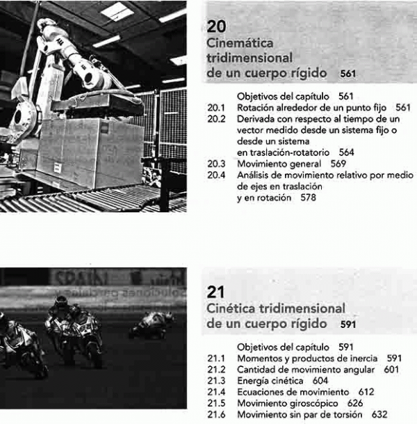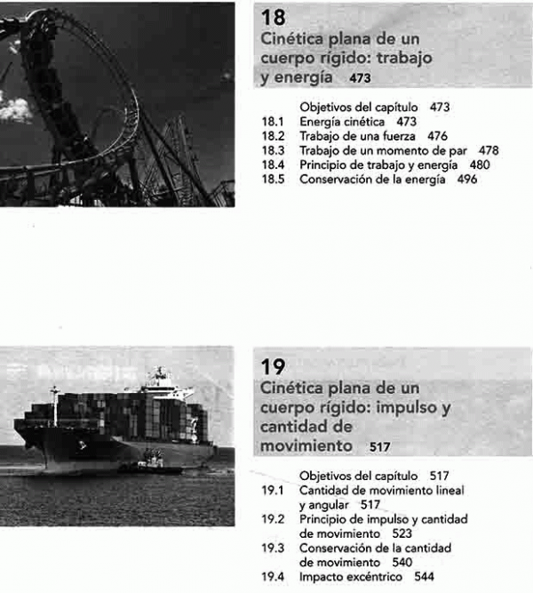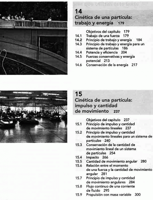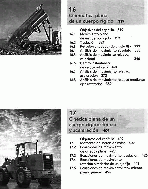 Cinemática de una partícula -- Cinética de una partícula: fuerza y aceleración -- Cinética de una partícula: trabajo y energía -- Cinética de una partícula: impulso y cantidad de movimiento --Cinemática plana de un cuerpo rígido -- Cinética plana de un cuerpo rígido: fuerza y aceleración -- Cinética plana de un cuerpo rígido: trabajo y energía -- Cinética plana de un cuerpo rígido: impulso y cantidad de movimiento -- Cinemática tridimensional de un cuerpo rígido -- Cinética tridimensional de un cuerpo rígido -- Vibraciones.