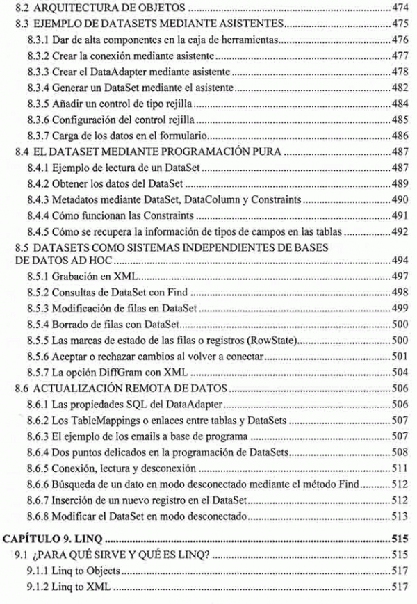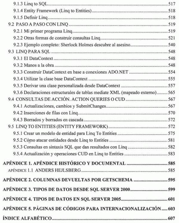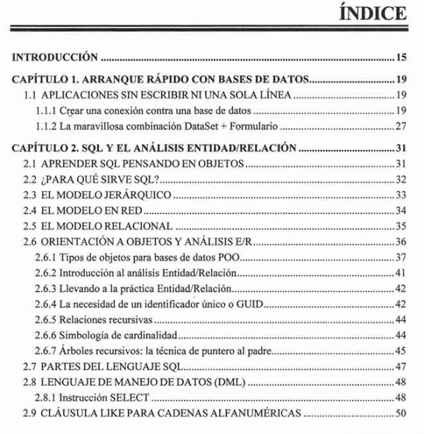 Dentro de los temas iniciales este libro cubre SQL, análisis Entidad/Relación, la tecnología ADO.NET, conexiones, ODBC, estructuras de bases de datos, transacciones, bloqueos, eventos, consultas clásicas, comandos, controles e interfaces
