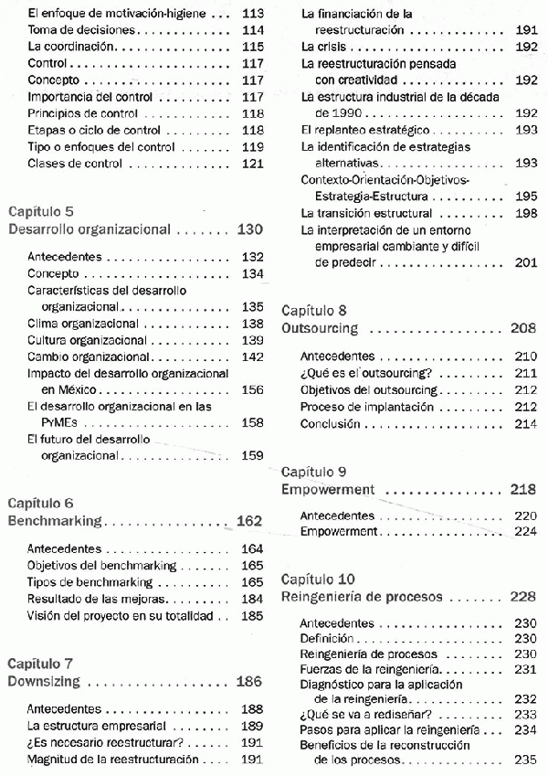 Además, el libro contiene algunas herramientas administrativas modernas como es el benchmarking, empowerment, downsizing, outsourcing, desarrollo organizacional, reingeniería de procesos, calidad total y seis sigma, herramientas que todo administrador debe conocer y aplicar para que el proceso administrativo resulte efectivo a estos tiempos, de tal modo que las organizaciones sean competitivas.