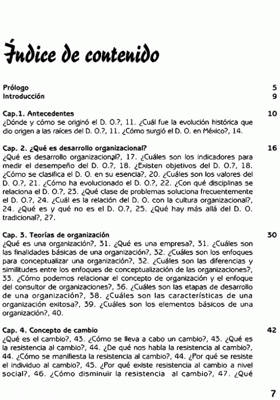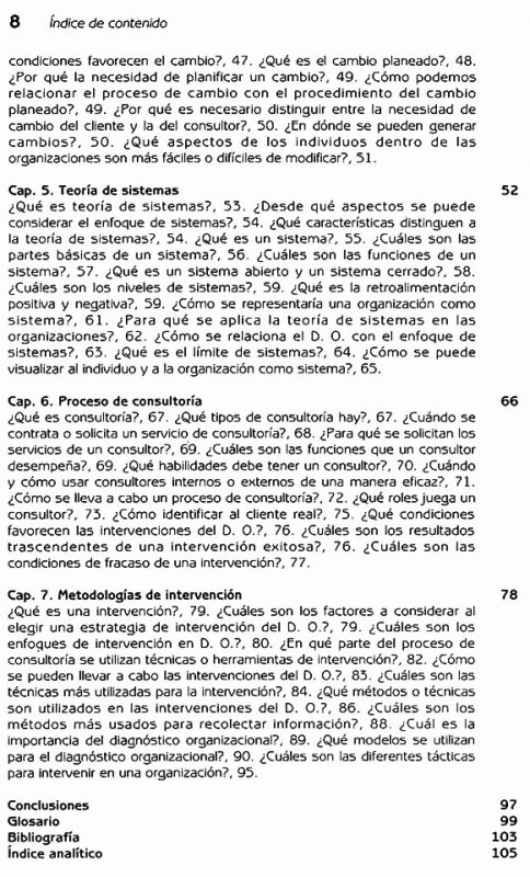 Las empresas que buscan perfeccionar su organización y optimizar el aprovechamiento de sus recursos humanos y materiales, encuentran en el Desarrollo Organizacional (D.O.) una opción viable para lograr el cambio, ya que adoptarlo permite resolver problemas de comunicación organizacional, crecimiento empresarial, satisfacción y desarrollo humano, eficiencia en el trabajo y adaptación al cambio tecnológico, entre otros. El objetivo de los autores es brindar al estudiante de la maestría en D.O., al gerente y al consultor, los elementos teóricos y prácticos que le permitirán conocer y aplicar las técnicas del D.O.