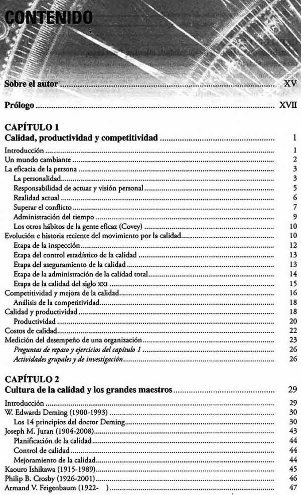 En la cuarta edición se abordan con detalle los principales conceptos, principios y estrategias de los sistemas de gestión de calidad, así como su relación con la productividad y la competitividad de una organización. Se exponen con detalle las herramientas estadísticas básicas para decidir con base en datos, el muestreo en aceptación y los aspectos mas relevantes de metodología como Seis Sigma, manifactura esbelta (lean) u las normas ISO-9000.