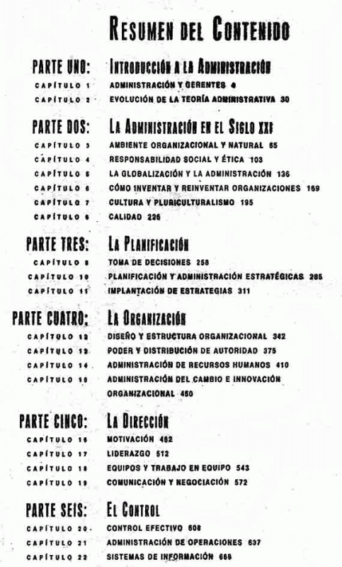 Introducción a la administración, la administración en el siglo XXI, la planificación, la organización, la dirección, el control.
