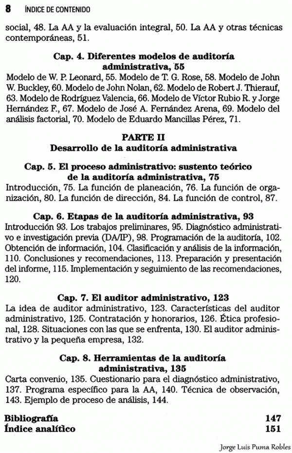 El autor de este libro realiza un análisis completo de la auditoria administrativa, en el cual explora sus orígenes, bases teóricas, funciones, objetivo y efectividad como herramienta de control en las organizaciones, y la compara con otros tipos de auditoria.