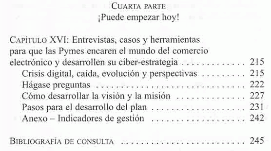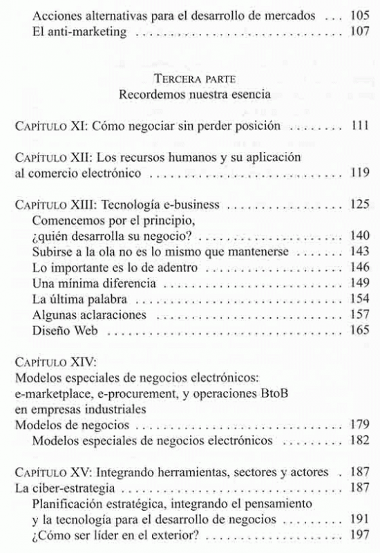 El libro presenta los elementos y los escenarios donde aparecen proyectos de negocios electrónicos. Los temas relacionados con los recursos humanos, la negociación, las tendencias de la web y el marketing y la publicidad digital.