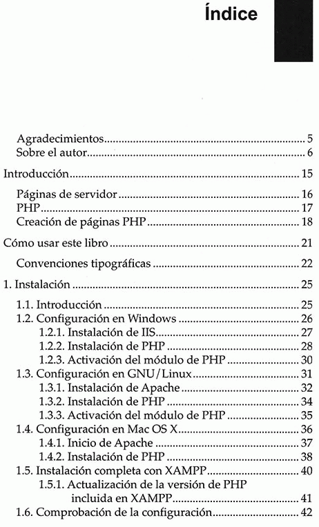 Una gran parte de los proyectos software desarrollados actualmente son aplicaciones Web, siendo PHP el lenguaje por excelencia en este campo con independencia del servidor Web y el sistema operativo que utilice. Este libro tiene todo lo que necesita para comenzar a trabajar con PHP. Tras llevar a cabo la instalación, ya sea en GNU/Linux, Windows o Mac OS X, conocerá la sintaxis del lenguaje PHP y aprenderá a usar variables, condicionales, bucles y expresiones para generar dinámicamente el contenido de sus páginas Web. Se describen además las nuevas características de PHP 5.3 y PHP 6, como los espacios de nombres y las nuevas extensiones, mostrando su aprovechamiento práctico. En los ejemplos desarrollados se enseñan técnicas como el procesamiento de formularios, mantenimiento de sesión con el usuario, almacenamiento de cookies, acceso al sistema de archivos y, en general, todo lo imprescindible para crear potentes aplicaciones Web.