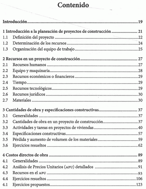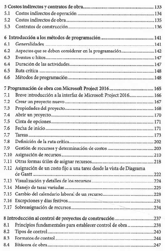 Este libro presenta de manera secuencial las etapas y procesos de una obra de construcción, desde su concepción y planeación, pasando por la programación, ejecución y control hasta la entrega final del proyecto. Recursos, cantidades de obra, costos directos, costos indirectos y métodos de programación son explicados en lo conceptual y por medio de ejercicios prácticos resueltos, para una mejor comprensión. También se incluye programación y control de obras por medio de Microsoft Project 2016, herramienta fundamental que ayuda a estimar tiempos y organizar recursos tipo material, costo y trabajo en una obra.