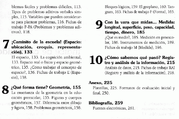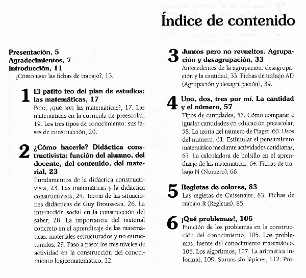 La obra incluye síntesis teórica sobre diversos tópicos del pensamiento matemático para preescolar, desde la perspectiva constructivista.