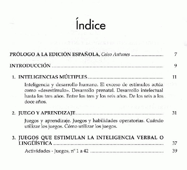En este libro, Celso Antunes propone más de 300 juegos o propuestas de estímulos para trabajar las inteligencias: Lingüística, lógico-matemática, espacial, musical, cenestésica-corporal, naturalista, pictórica y personal.