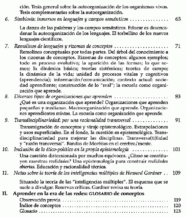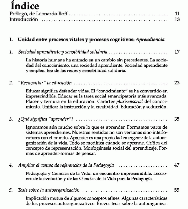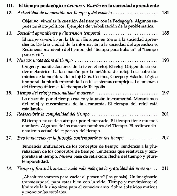 El autor repasa los avances de las tecnologías, las novedades de la biociencia, las transformaciones de la vida cotidiana y de la vida escolar, las amenazas de la exclusión social, las condiciones que ha de tener una sociedad aprendiente, etc.