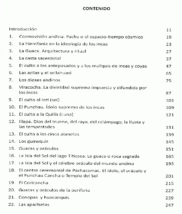 Este libro enfatiza hasta qué punto la ideología ha condicionado la historia andina de los Incas, para lo cual analiza en profundidad el contexto social y político en el que acontecen la religion preinca e incaico, es decir, el culto acendrado a múltiples divinidades de la concepción tridimensional: Hanan Pacha, Kay Pacha y Uju Pacha.