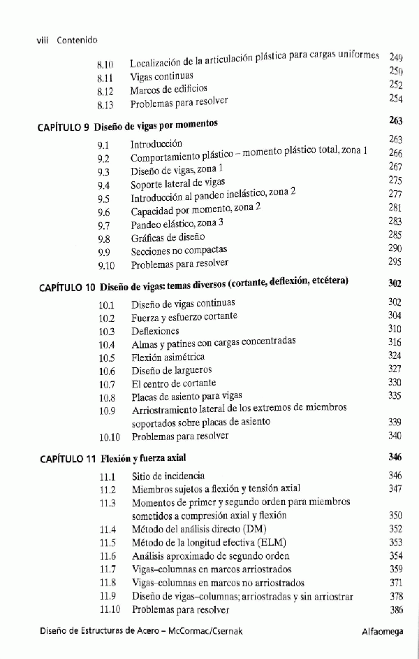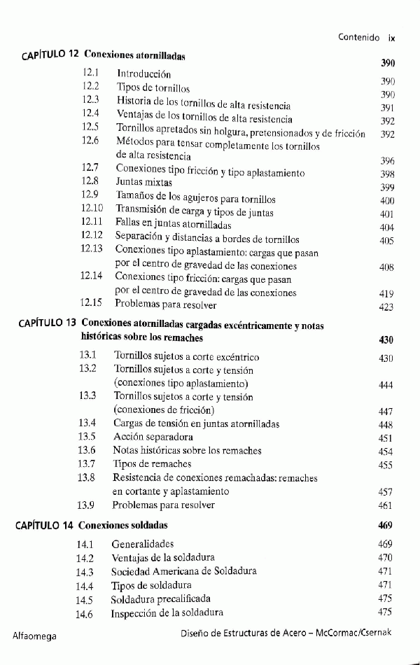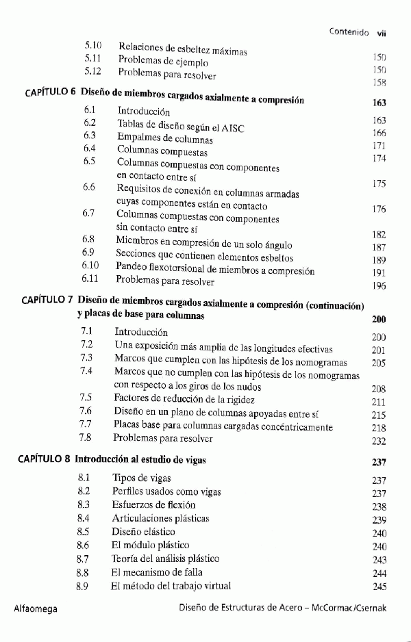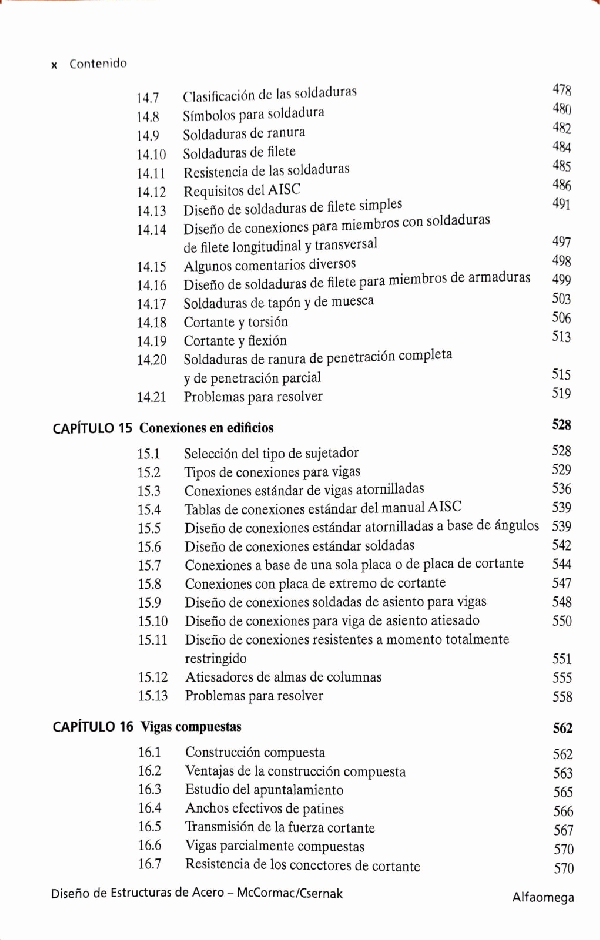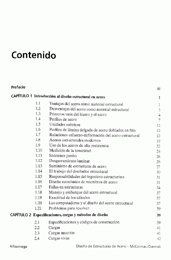 Introducción al diseño estructural en acero -- Especificaciones cargas y métodos de diseño -- Análisis de miembros a tensión -- Diseño de miembros a tensión -- Introducción a los miembros cargados axialmente a compresión -- Diseño de miembros cargados axialmente a compresión -- Diseño de miembros cargados axialmente a compresión( continuación) y placas de base para columnas. -- Introducción al estudio de vigas -- Diseño de vigas por momentos -- Diseño de vigas: temas diversos ( cortante, deflexión, etc) -- Flexión y fuerza axial -- Conexiones atornilladas -- Conexiones atornilladas cargadas excéntricamente y notas históricas sobre los remaches -- Conexiones soldadas -- Conexiones en edificios -- Vigas compuestas -- Columnas compuestas -- Vigas con cubre placas y trabes armadas -- Diseño de edificios de acero.