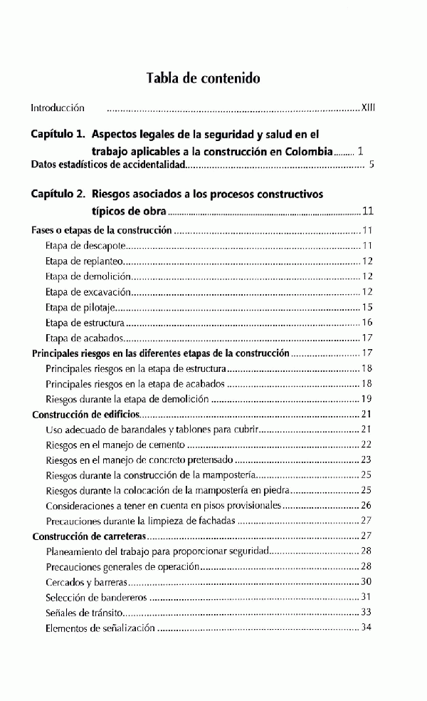 Esta obra presenta, en primer lugar, los aspectos legales de la seguridad y salud en el trabajo, según la nueva denominación introducida por la Ley 1562 de 2012, aplicables a la industria de la construcción en Colombia; posteriormente se citan algunos datos estadísticos de accidentalidad; luego , se abarcan los riesgos asociados a los diferentes procesos constructivos típicos de obra, la técnica para su identificación, evaluación y priorización.