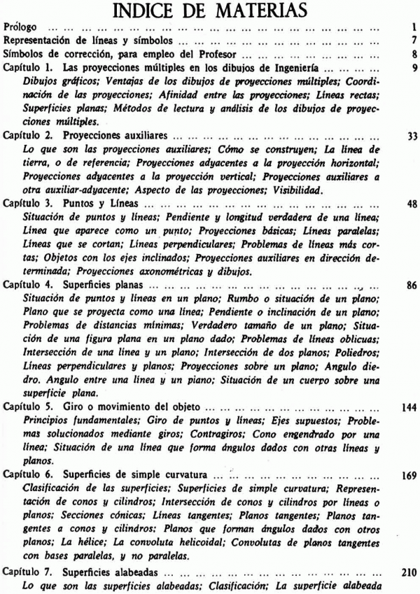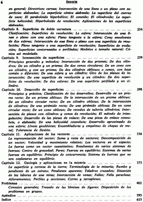 Proyecciones múltiples en los dibujos de ingeniería -- Proyecciones auxiliares -- puntos y lineas -- superficies planas -- Giro o movimiento del objeto -- Superficie de simple curvatura -- Superficie alabeadas -- Superficie de doble curvatura -- Intersección de superficies -- Desarrollo de superficies -- Aplicaciones de los Vectores --Geología y aplicaciones en la minería.
