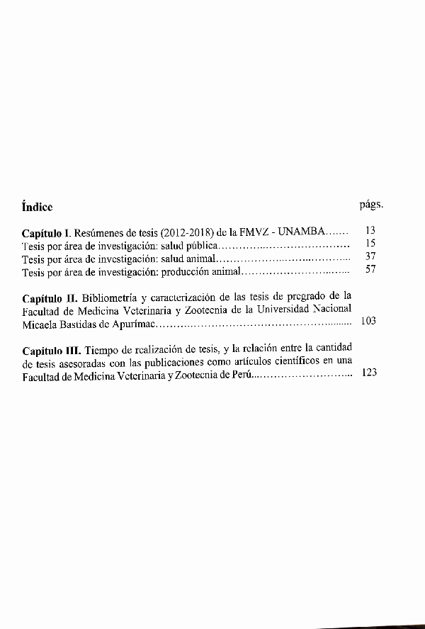 Capítulo I.- Resumen de tesis ( 2012-2018) de la FMVZ-UNAMBA -- Capítulo II.-Bibliometría y caracterización de las tesis de pregrado de la Facultad de Medicina Veterinaria y Zootecnia de la Universidad Nacional Micaela Bastidas de Apurímac -- Capítulo III.- Tiempo de realización de tesis, y la relación entre la cantidad de tesis asesoradas con las publicaciones como artículos científicos en una Facultad de Medicina Veterinaria y Zootecnia de Perú.